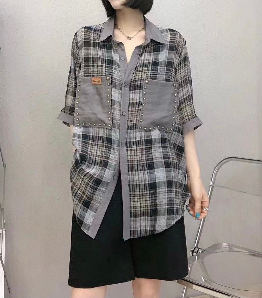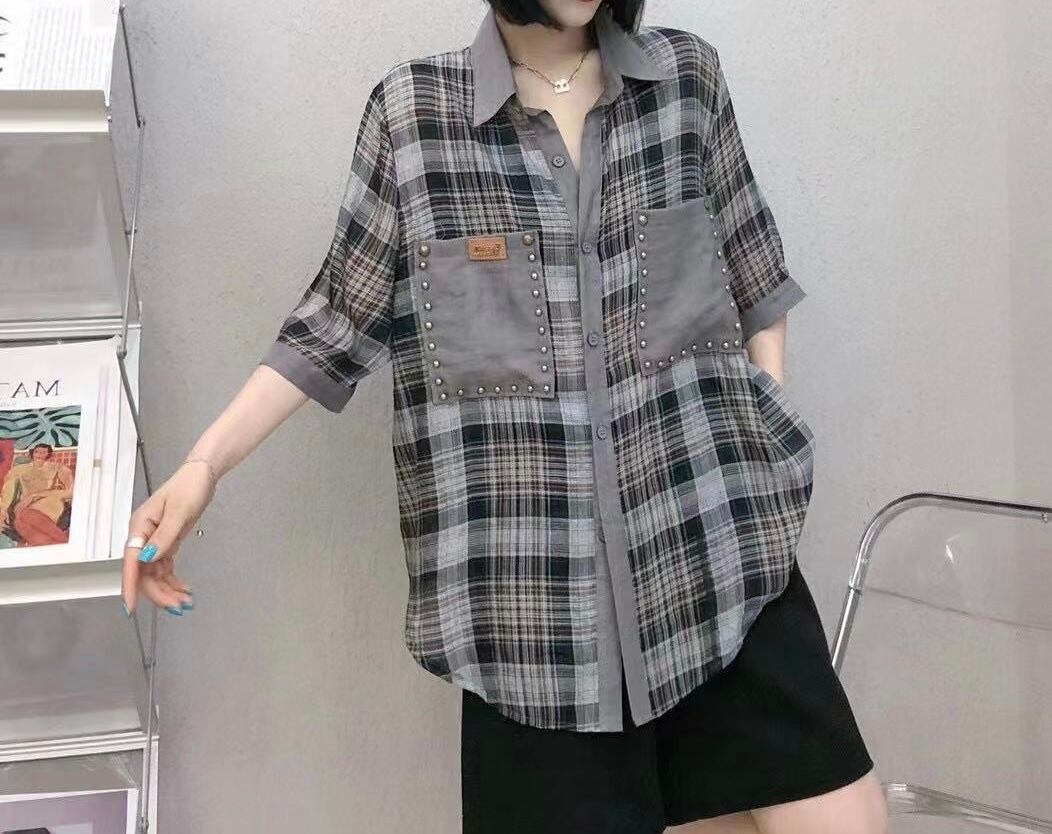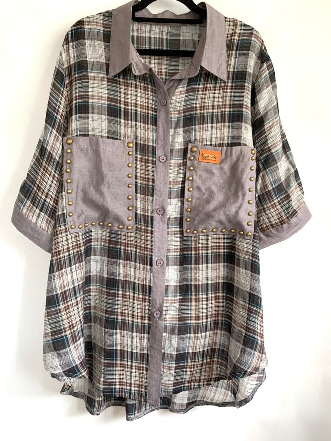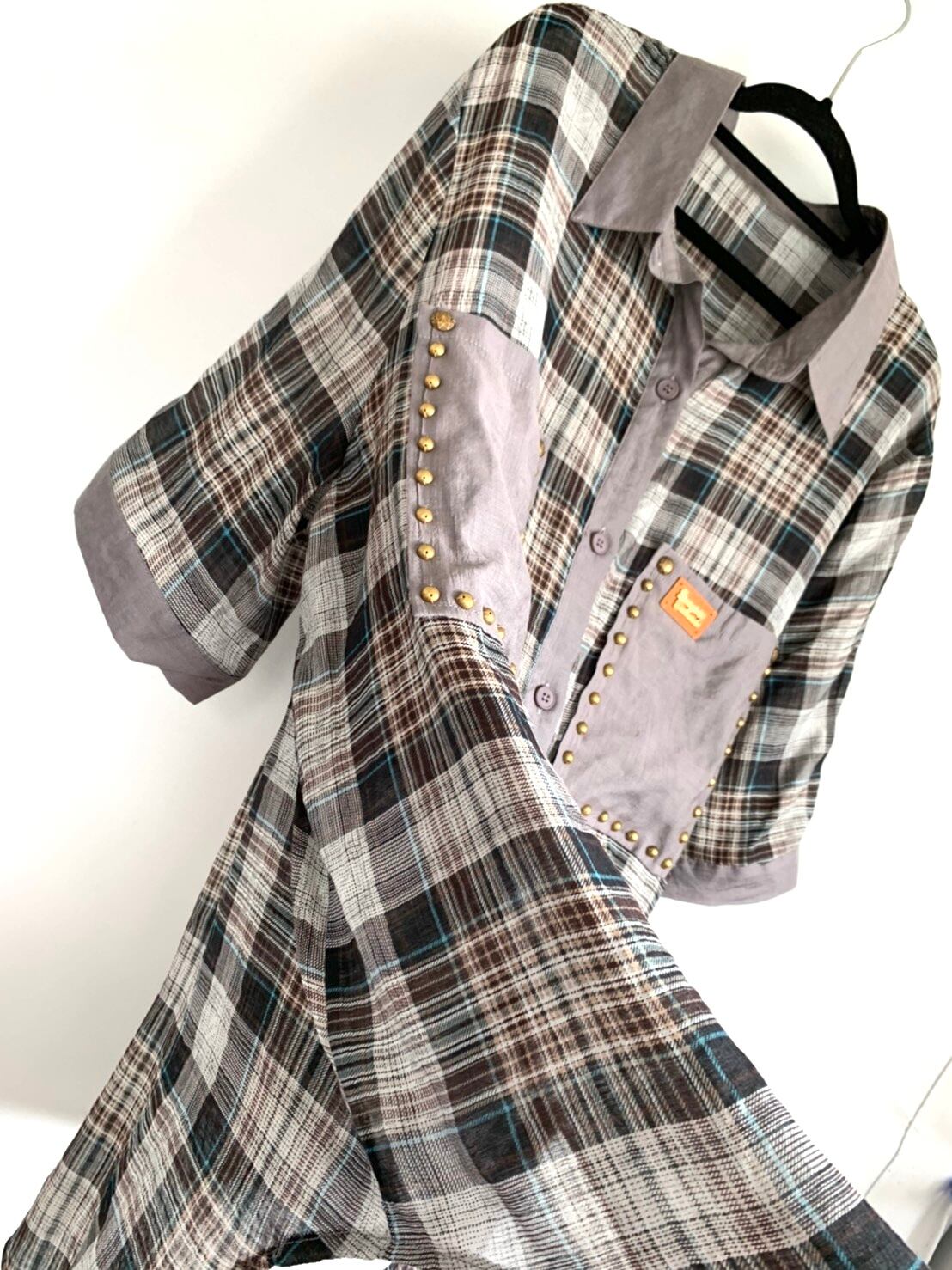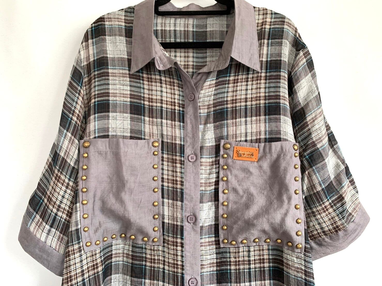 ふわふわしたチェック柄のコットン生地に大きな鋲付きの胸ポケットが