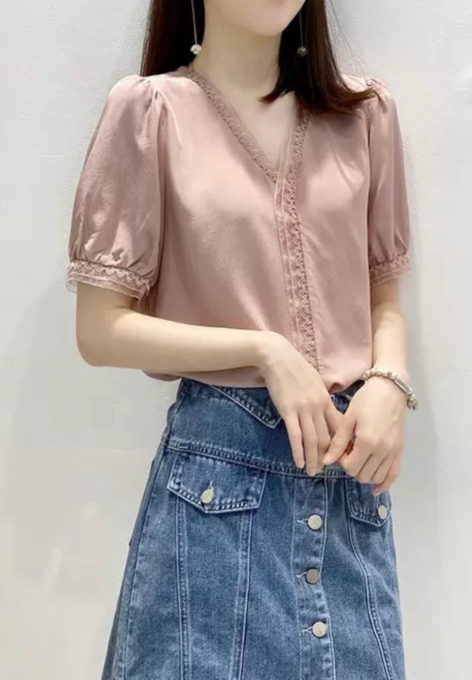 Vネック シルク混 可愛い系トップス デートコーデ レース 乙女系コーデ 万能