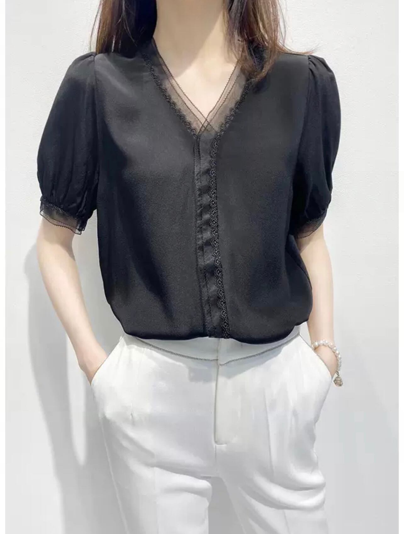 Vネック シルク混 かわカッコいい系トップス デートコーデ レース お姉さんコーデ 万能