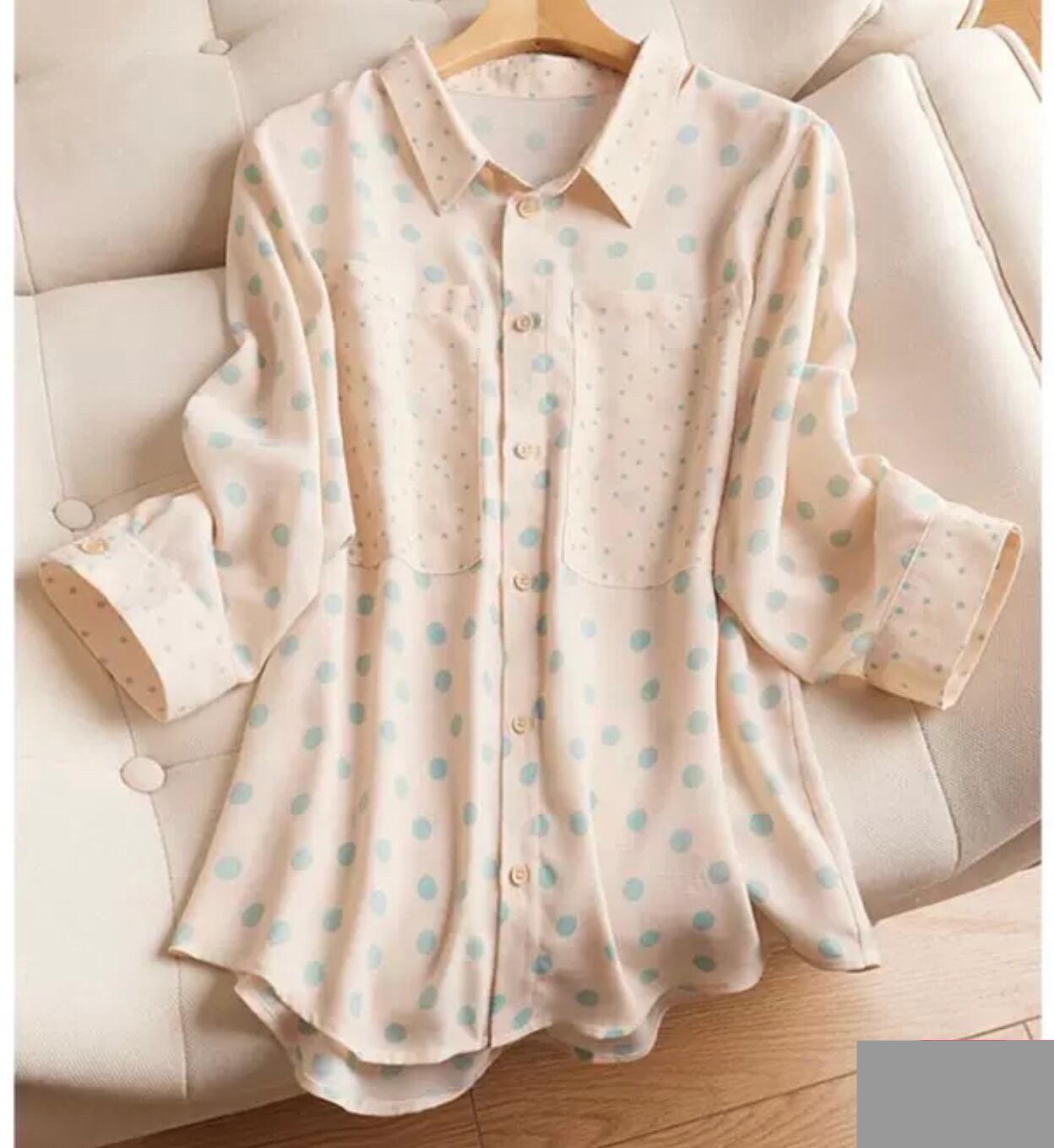 七分袖 ドット柄 お洒落シャツ 水玉模様 カジュアルお洒落コーデ お出かけコーデ 今時コーデ